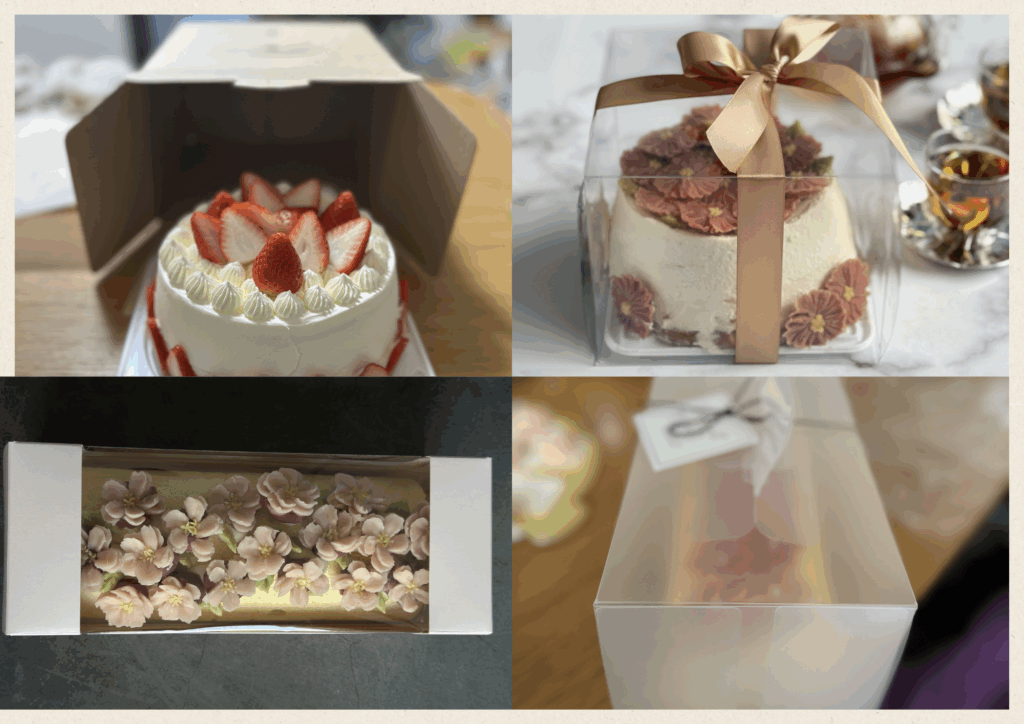 小さなホールやロールケーキ型のシフォンでも、**デコレーション**の美しさを損なわない箱を選んでいます。