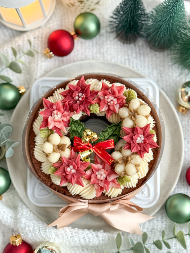 どちらも天板で焼いた米粉シフォンを丸いセルクルで抜いて、リースの形にして仕上げました🎉
