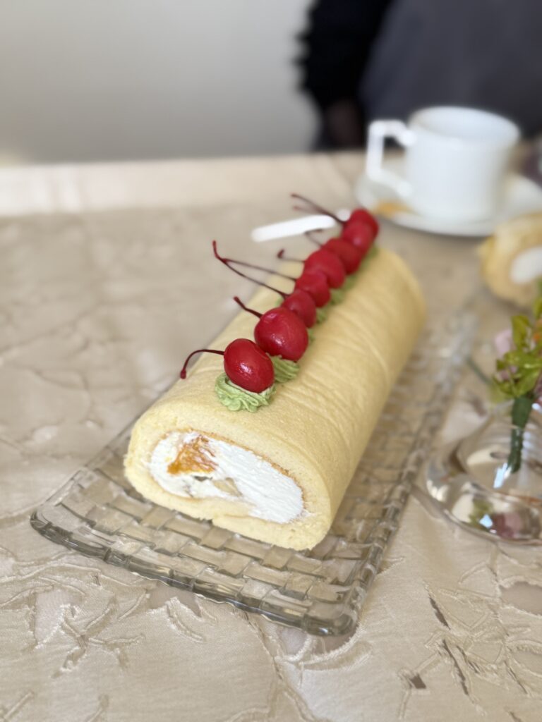 平らな天板で焼いたシフォン生地は、くるくると巻いてロールケーキに。